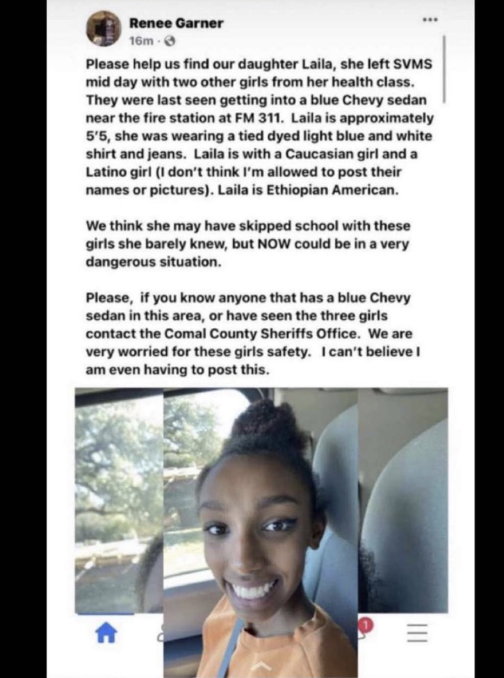 “We’re hoping she is still with the two girls,” Laila’s mom Renee Garner told News4SA Tuesday night. “We’re worried if they get split up and they are out here. Anybody can pick them up on the side of the road. We just hate to think what the worst that can happen.”