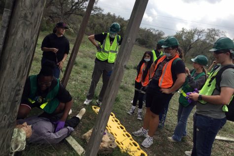 Senior Garrett Blanchard (right) leads his team in a disaster simulation for the final part of the Community Emergency Response Team program. CERT was established by the Federal Emergency Management Agency in 1993 to better prepare young people for high stress and dangerous situations.
