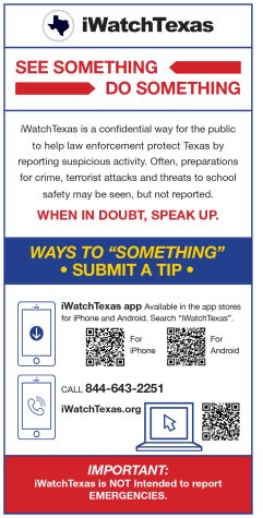 The Texas Suspicious Activity Reporting Network, iWatchTexas, part of the Texas Department of Public Safety Fusion Center, is a website where community members can report suspicious activities or behaviors that may indicate criminal, terroristic, or school safety-related threats.