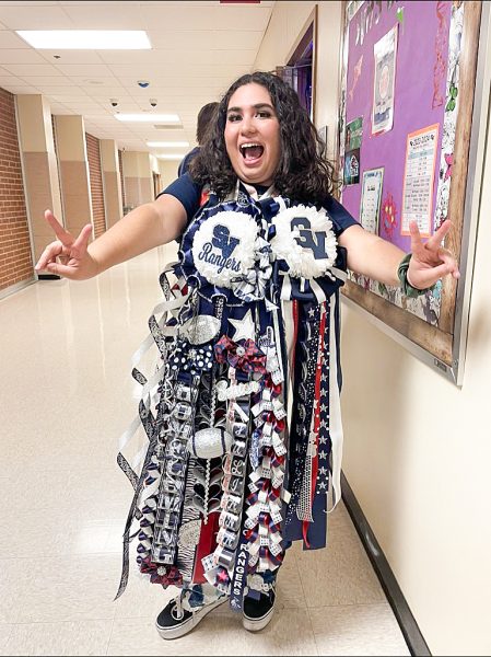 Showing off her school spirit senior Juliana Roman happily poses with her homecoming mums in between classes