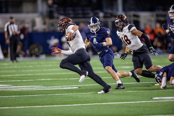Senior Jackson Duffey runs to tackle an Aledo player at the state championship on Dec. 15.
