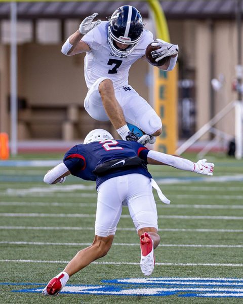 Senior wide receiver Brody Day gets airborne over a Roosevelt defender during the 45-0 blowout at Comalander on Thursday.