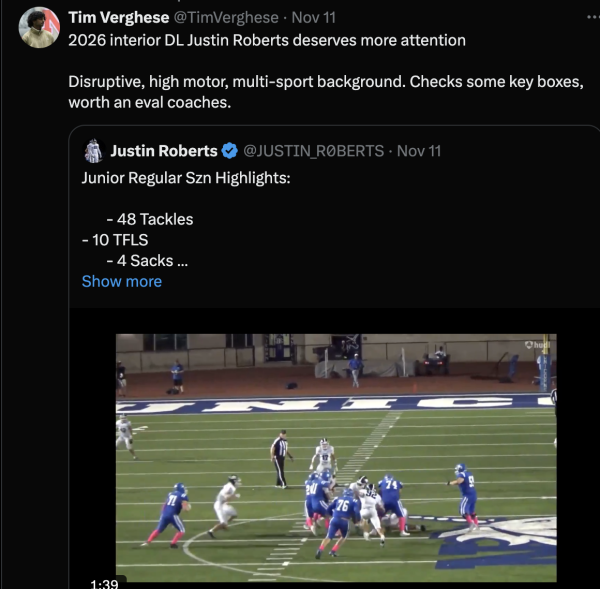 Heading into Friday’s win over New Braunfels, junior DT Justin Roberts had a more than 60 tackles, 11 tackles for loss, 3 sacks, 7 hurries and 2 batted balls and was No. 13 in Along the Wire’s Class of 2026 Top 30 pre-season.