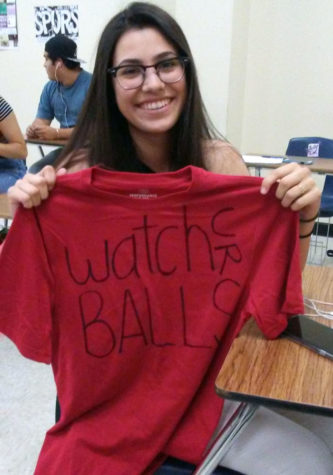 Senior Britney Bitgood shows off team shirt for dodgeball tournament.