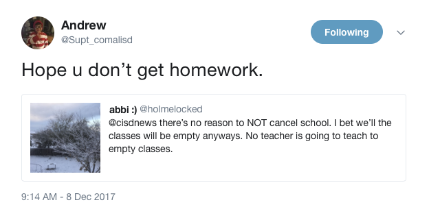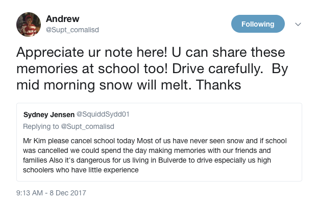 Students bargained with superintendent Andrew Kim over Twitter. The school district announced about 8:30 last night school would be delayed by two hours, leading some students to continue to beg for a full snow day.